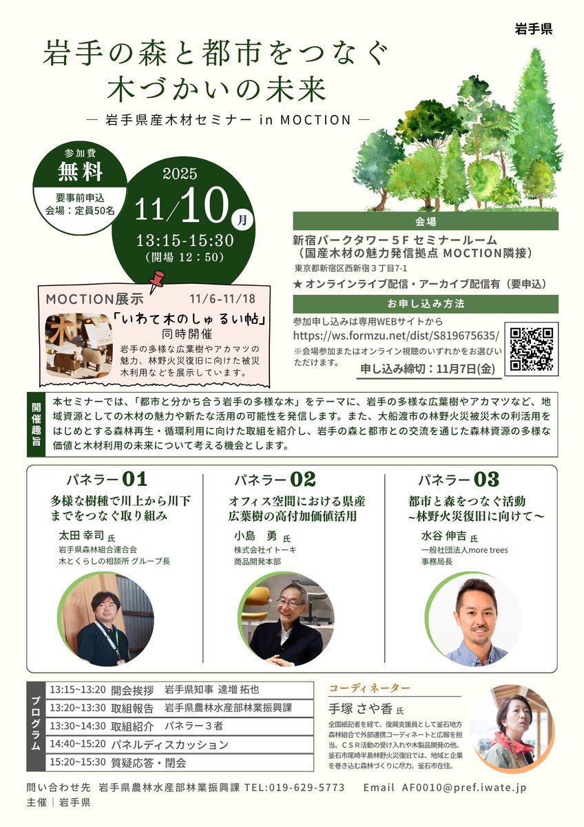 令和7年11月10日(月)に「岩手の森と都市をつなぐ木づかいの未来」-岩手県産木材セミナーin MOCTIONを開催します!